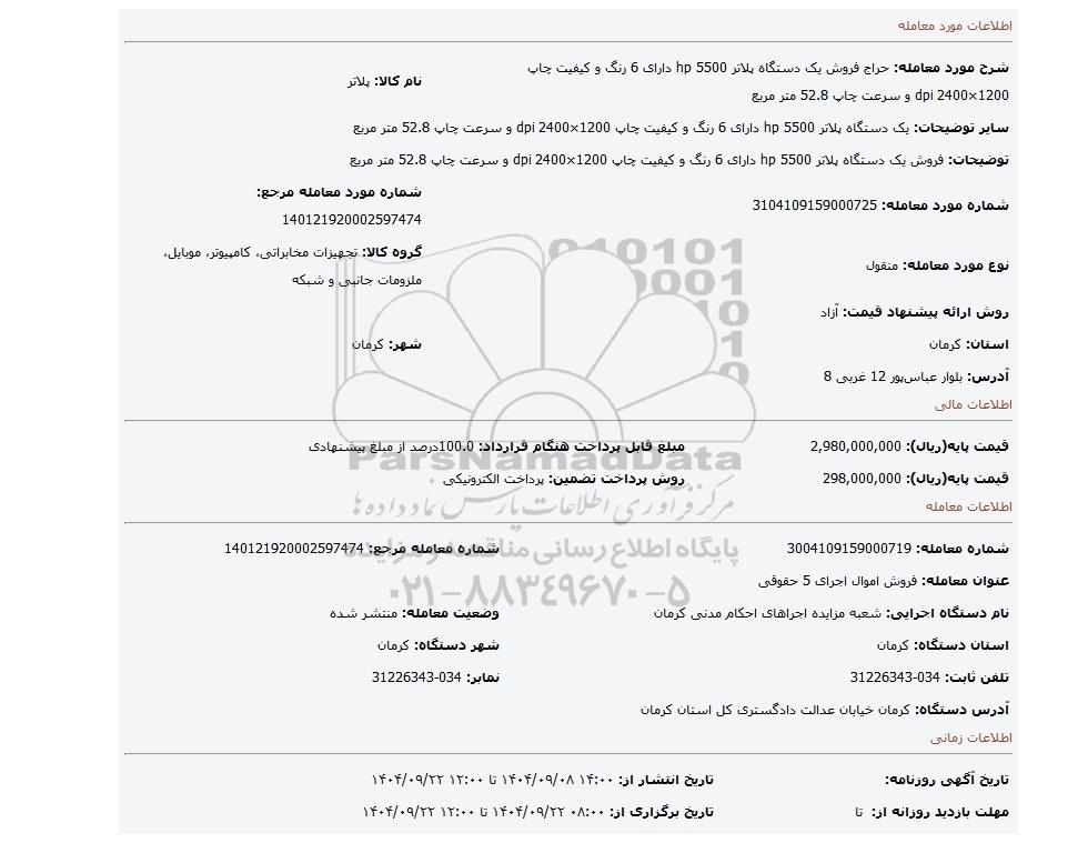 | شرح مورد معامله: حراج فروش یک دستگاه پلاتر hp 5500 دارای 6 رنگ و کیفیت چاپ 1200×2400 dpi و سرعت چاپ 52.8 متر مربع | نام کالا: پلاتر | |