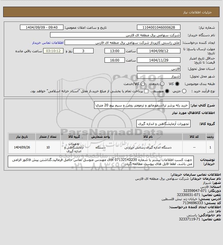 شرح کلی نیاز: خرید رله پرشر ترانسفورماتور و ترمومتر روغن و سیم پیچ 20 متری