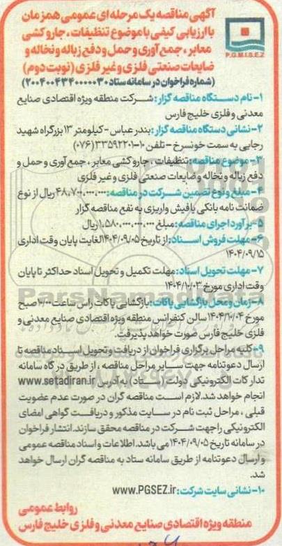 مناقصه تنظیفات ، جاروکشی معابر، جمع آوری و حمل و دفع زباله و نخاله و ضایعات صنعتی فلزی و غیر فلزی- نوبت دوم از کلیه افراد متخصص و شرکت‌ها واجد شرایط دعوت به عمل می‌آید در مناقصه با کد خبرگزاری پارس نماد: 9920279 شرکت نمایند. این مناقصه در تاریخ 1404/09/09 شروع و مهلت آن تا تاریخ 1404/09/15 میباشد.