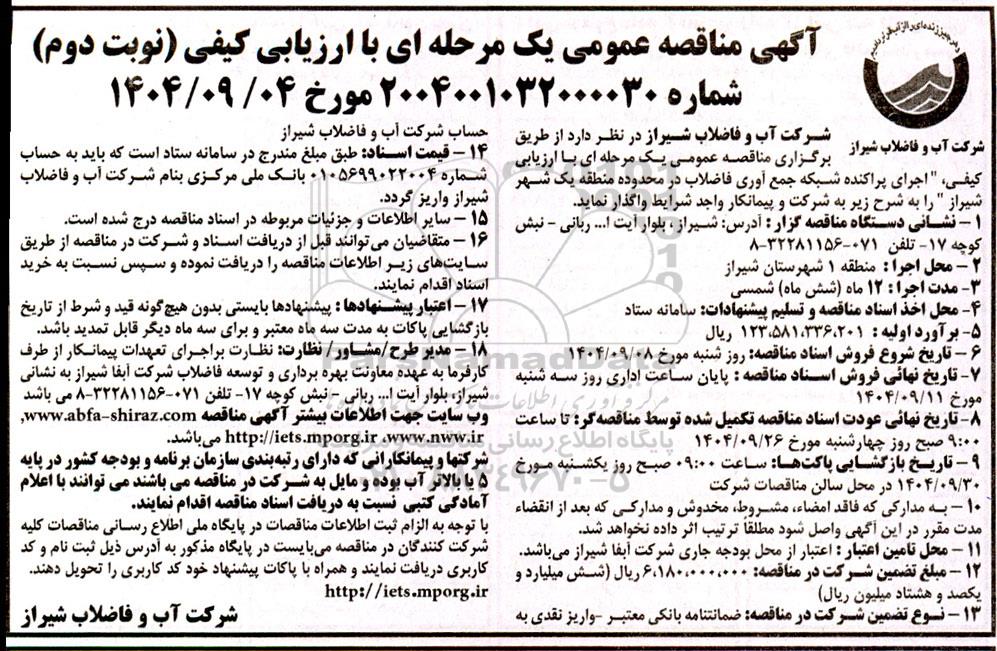 شرکت آب و فاضلاب شیراز در نظر دارد از طریق برگزاری مناقصه عمومی یک مرحله ای با ارزیابی کیفی، "اجرای پراکنده شبکه جمع آوری فاضلاب در محدوده منطقه یک شهر شیراز" را به شرح زیر به شرکت و پیمانکار واجد شرایط واگذار نماید.