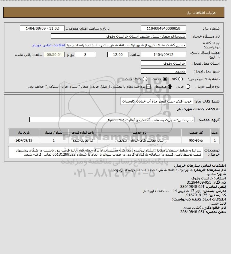 شرح کلی نیاز: خرید اقلام جهت تعمیر چاه آب خیابان کارمندان
