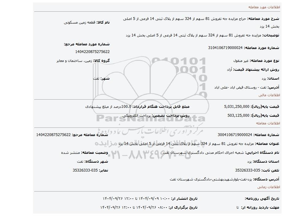 | شرح مورد معامله: حراج مزایده جه تفروش 81 سهم از 324 سهم از پلاک ثبتی 14 فرعی از 5 اصلی بخش 14 یزد | نام کالا: قطعه زمین مسکونی | |