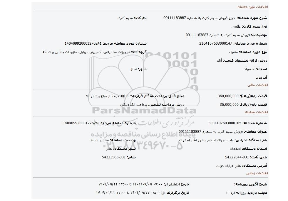 | عنوان معامله: فروش سیم کارت به شماره 09111183887 | ||