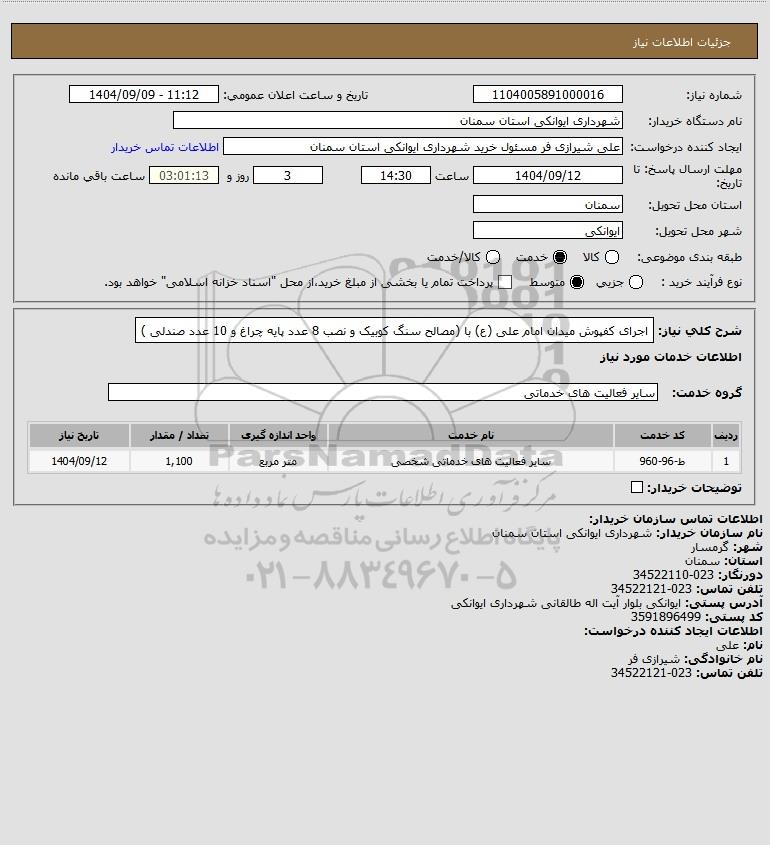 شرح کلی نیاز: اجرای کفپوش میدان امام علی (ع) با (مصالح سنگ کوبیک و نصب 8 عدد پایه چراغ و 10 عدد صندلی )