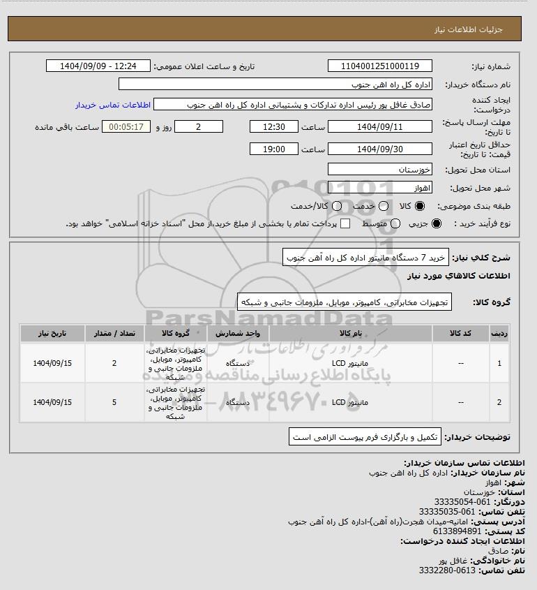 شرح کلی نیاز: خرید 7 دستگاه مانیتور اداره کل راه آهن جنوب