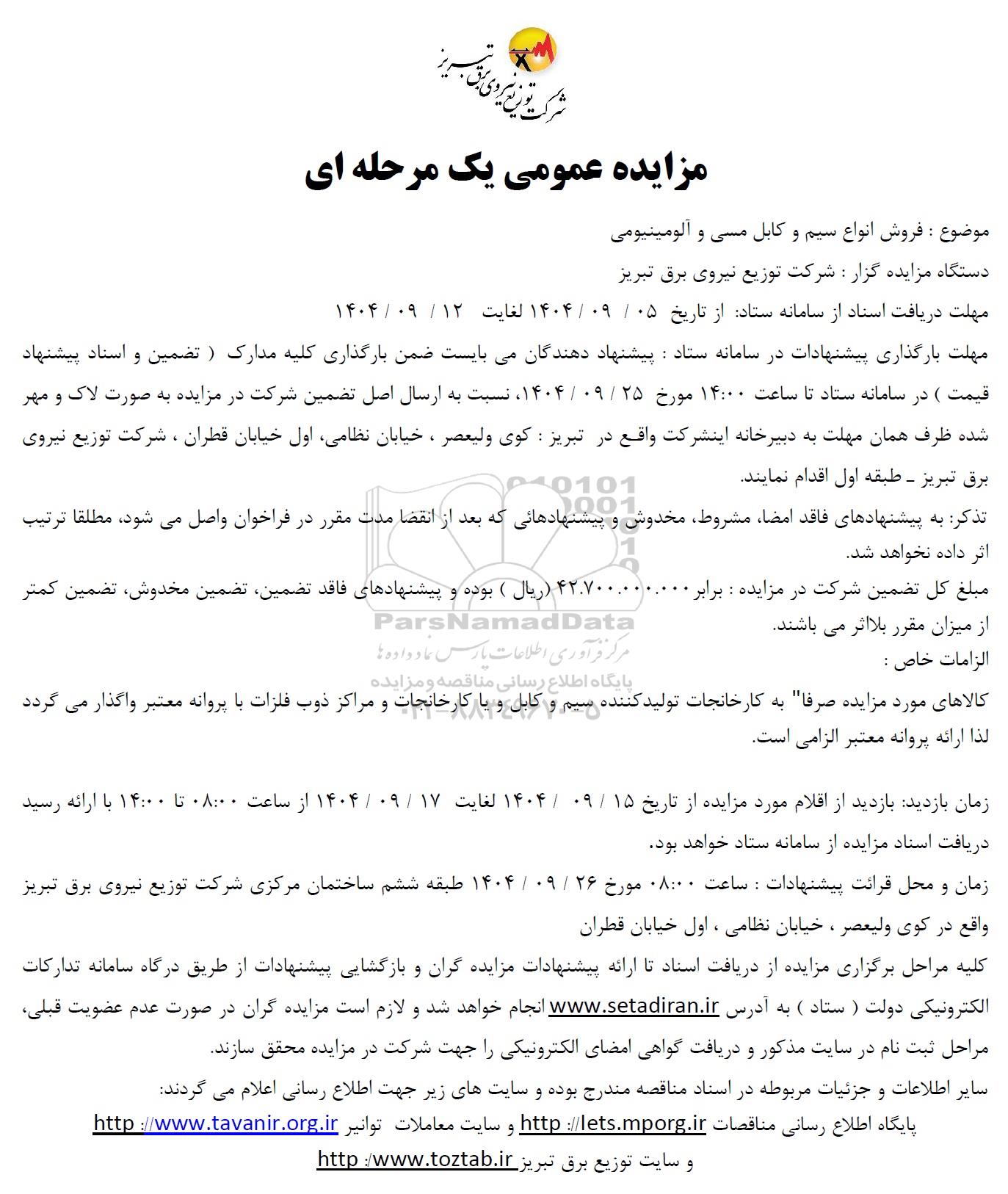 مزایده عمومی مزایده عمومی فروش انواع سیم و کابل مسی و آلومینیومی -مزایده روز یکشنبه نهم آذر ماه 1404 برگزار میگردد. از کلیه افراد متخصص و شرکت‌های واجد شرایط دعوت به عمل می‌آید تا در این مزایده با کد خبرگزاری پارس نماد : 9921857 شرکت نمایند تاریخ شروع مزایده : 1404/09/10 مهلت شرکت در مزایده: تا پایان روز 1404/09/12 مکان برگزاری اموال واگذاری استان‌های آذربایجان شرقی و دسته‌بندی‌های مربوط به این حراجی آلومینیوم و پروفیل PVC, برق, سیم و کابل, قطعات مس و برنج میباشد.