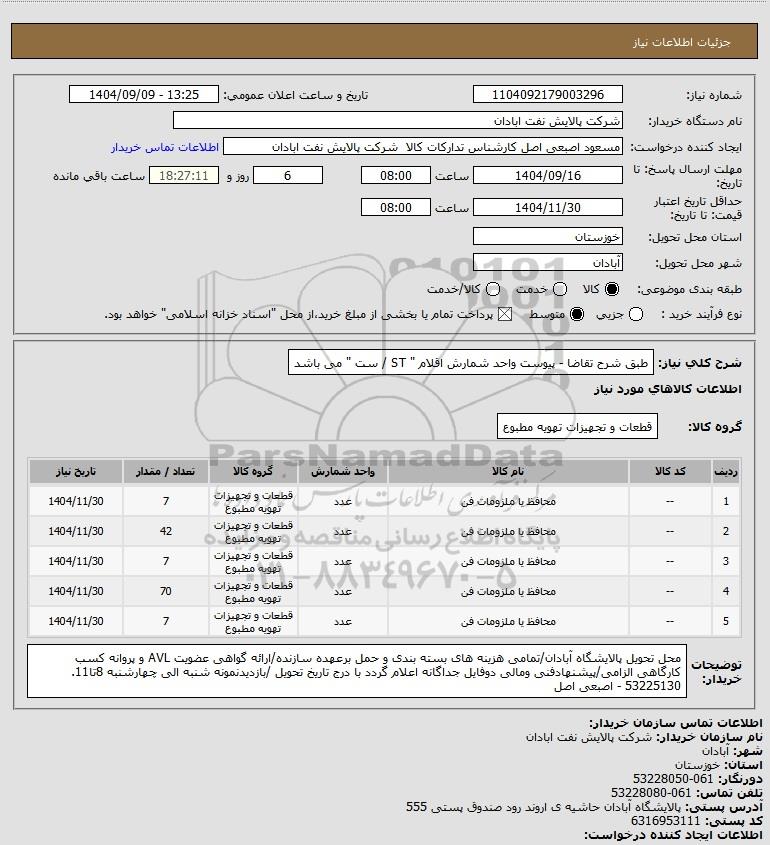 شرح کلی نیاز: طبق شرح تقاضا - پیوست واحد شمارش اقلام " ST / ست " می باشد