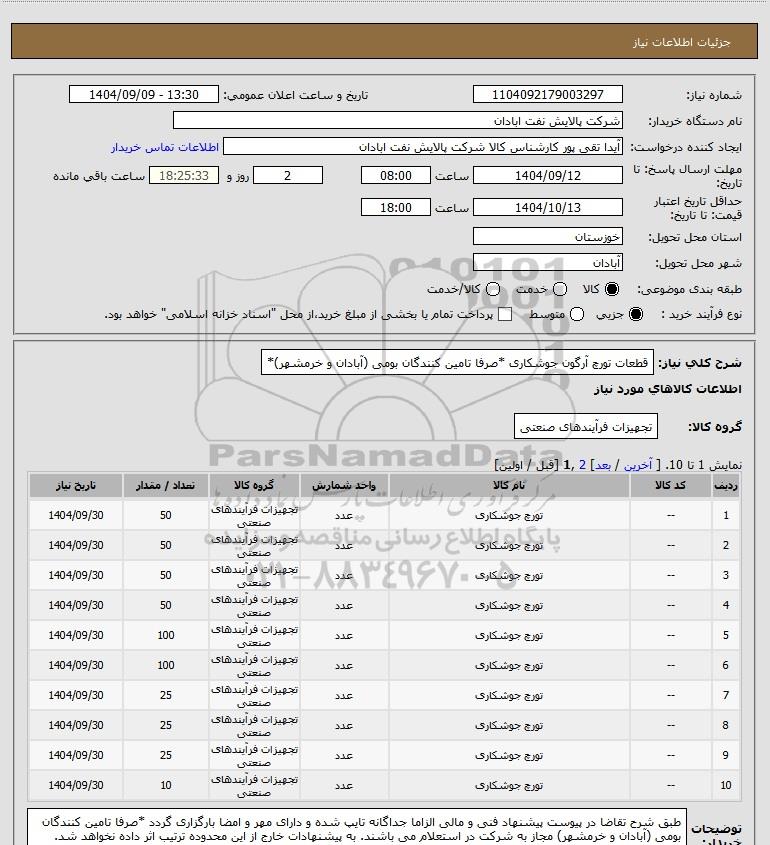 شرح کلی نیاز: قطعات تورچ آرگون جوشکاری *صرفا تامین کنندگان بومی (آبادان و خرمشهر)*
