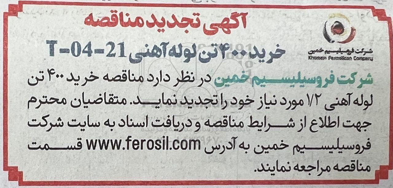 تجدید مناقصه خرید 400 تن لوله آهنی -مناقصه روز یکشنبه نهم آذر ماه 1404, تجدید مناقصه خرید 400 تن لوله آهنی 21- 04 -T