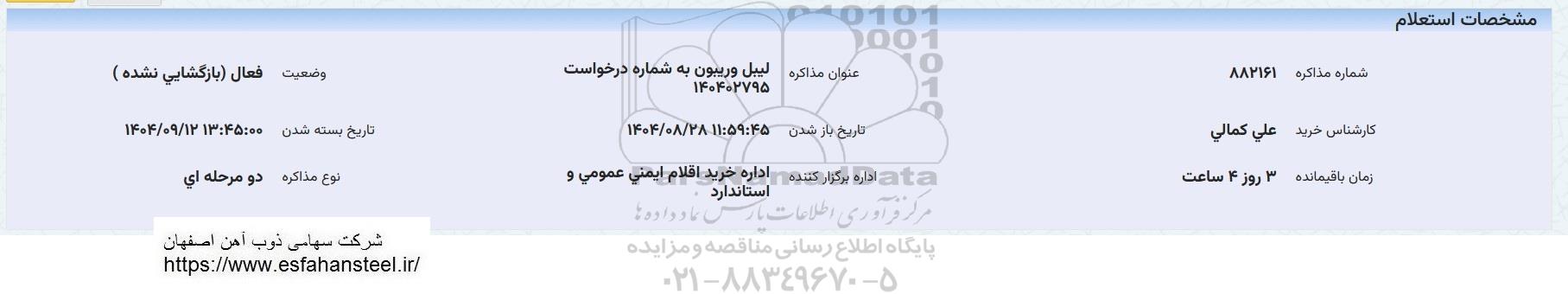 استعلام بها و موضوع استعلام استعلام لیبل و ریبون به اطلاع کلیه شرکتها و افراد متخصص واجد شرایط میرساند، آگهی گذار در نظر دارد از طریق استعلام بها، نسبت به انتخاب و دریافت پیشنهادات اقدام نماید. این استعلام با کد آگهی ثبت شده در سامانه خبرگزاری پارس نماد : 9922313 منتشر شده است. مشخصات استعلام : تاریخ شروع استعلام: 1404/09/09 آخرین مهلت ارسال پیشنهاد قیمت : 1404/09/12 و محل اجرای پروژه : استان مناقصات استان اصفهان میباشد. استعلام قیمت مورد درخواست : استعلام لیبل و ریبون با دستهبندیهای تخصصی و گروه های مرتبط : طراحی چاپ و تبلیغات, لیبل, کامپیوتر, ماشین اداری, استعلام اطلاع رسانی میگردد.