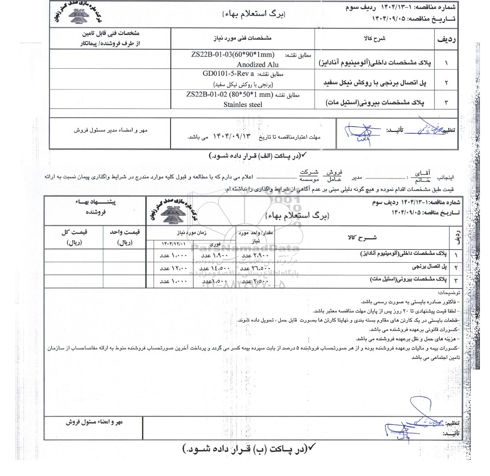 استعلام بهاء، مناقصه پلاک مشخصات داخلی (آلومینیوم آنادایز)...-مناقصه روز یکشنبه نهم آذر ماه 1404, استعلام بهاء، مناقصه پلاک مشخصات داخلی (آلومینیوم آنادایز)...
