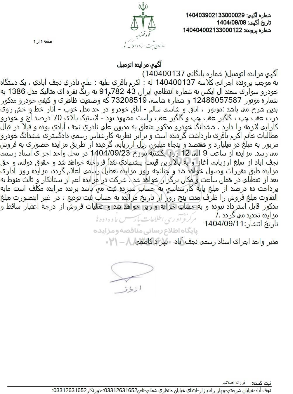 آگهی مزایده اتومبیل (شماره بایگانی 140400137)
