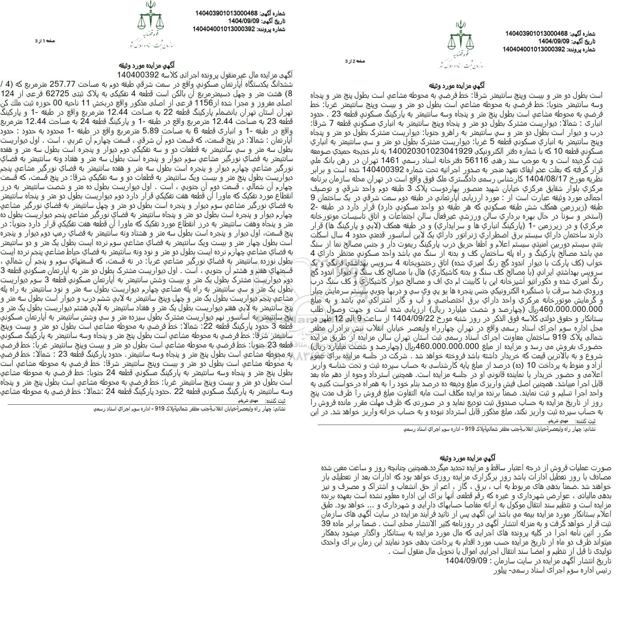 آگهی مزایده مال غیر منقول پرونده اجرائی کلاسه 140400392 ششدانگ یکدستگاه آپارتمان مسکونی واقع در سمت شرقي طبقه دوم به مساحت 257.77 متر مربع که (4) .(8) هشت متر و چهل دسیمتر مربع آن بالکن است قطعه 4 تفکیکی به پلاک ثبتی 62725 فرعی از 124 اصلی مفروز و مجزا شده از 1156 فرعی از اصلی مذکور واقع در بخش 11 ناحیه 00 حوزه ثبت ملك كن تهران استان تهران با انضمام پارکینگ قطعه 22 به مساحت 12.44 متر مربع واقع در طبقه 1 و پارکینگ قطعه 23 به مساحت 12.44 متر مربع واقع در طبقه 1- و پارکینگ قطعه 24 به مساحت 12.44 متر مربع واقع در طبقه 1- و انباری قطعه 6 به مساحت 5.89 متر مربع واقع در طبقه 1- محدود به حدود : حدود آپارتمان : شمالا در پنج قسمت که قسمت دوم آن شرقي ، قسمت چهارم آن غربی ، است . اول دیواریست بطول سه متر و سي سانتیمتر به قطعات دو و سه تفكيكي دوم دیوار و پنجره است بطول سه متر و هفده سانتیمتر به فضای نورگیر مشاعی سوم دیوار و پنجره است بطول سه متر و هفتاد و نه سانتيمتر به فضاي نورگیر مشاعی چهارم دیوار و پنجره است بطول سه متر و هفده سانتیمتر به فضاي نورگیر مشاعی پنجم دیواریست بطول پنج متر و بیست و یک سانتیمتر به قطعات دو و سه تفکیکی شرقا در پنج قسمت که قسمت چهارم آن شمالي ، قسمت دوم ان جنوبي ، است. اول دیواریست بطول ده متر و شصت سانتیمتر به درز انقطاع مورد تفکیک که ماورا آن قطعه هفت تفکيکي قرار دارد دوم دیواریست بطول دو متر و پنجاه سانتیمتر به فضاي نورگیر مشاعی سوم دیوار و پنجره است بطول دو متر و چهل سانتیمتر به فضاي نورگیر مشاعي چهارم دیوار و پنجره است بطول دو متر و پنجاه سانتیمتر به فضای نورگیر مشاعی پنجم دیواریست بطول ده متر و پنجاه و هفت سانتیمتر به درز انقطاع مورد تفکیک که ماورا آن قطعه هفت تفكيكي قرار دارد جنوبا در پنج قسمت اول دیوار و پنجره است بطول سه متر و هشتاد و نه سانتيمتر به فضای رمپ دوم دیوار و پنجره است بطول چهار متر و بیست و یک سانتیمتر به فضاي مشاعي سوم نرده ایست بطول یک متر و دو سانتیمتر به فضاي مشاعي چهارم نرده ایست بطول دو متر و نود و نه سانتيمتر به فضای حیاط مشاعی پنجم نرده ایست بطول نوزده سانتیمتر به فضاي نورگیر مشاعي غربا در نه قسمت که قسمتهای سوم و پنجم آن شمالي ، قسمتهای هفتم و هشتم آن جنوبی ، است . اول دیواریست مشترک بطول دو متر به آپارتمان مسکوني قطعه 3 دوم دیواریست مشترک بطول یک متر و بیست و شش سانتیمتر به آپارتمان مسكوني قطعه 3 سوم دیواریست بطول یک متر و سي سانتیمتر به راه پله مشاعی چهارم دیواریست بطول سه متر و نود سانتیمتر به راه پله مشاعی پنجم دیواریست بطول یک متر و چهل و پنج سانتیمتر به لابی ششم درب و دیوار است بطول سه متر و پنج سانتیمتر به لابي هفتم دیواریست بطول یک متر و هفتاد سانتیمتر به لابی هشتم دیواریست بطول یک متر و پنج سانتیمتر به آسانسور نهم دیواریست مشترک بطول سیزده متر و سي و شش سانتیمتر به آپارتمان مسکوني قطعه 3 حدود پارکینگ قطعه 22 شمالا خط فرضی به محوطه مشاعی است بطول دو متر و بیست و پنج سانتیمتر شرقا خط فرضی به محوطه مشاعی است بطول پنج متر و پنجاه و سه سانتیمتر به پارکینگ مسکونی قطعه 23 جنوبا خط فرضي به محوطه مشاعي است بطول دو متر و بیست و پنج سانتیمتر غربا خط فرضي به محوطه مشاعی است بطول پنج متر و پنجاه و سه سانتیمتر حدود پارکینگ قطعه 23 : شمالا : خط فرضي به محوطه مشاعی است بطول دو متر و بیست و پنج سانتیمتر شرقا خط فرضی به محوطه مشاعی است بطول پنج متر و پنجاه و سه سانتیمتر به پارکینگ مسکونی قطعه 24 جنوبا خط فرضي به محوطه مشاعي است بطول دو متر و بیست و پنج سانتیمتر غربا خط فرضي به محوطه مشاعی است بطول پنج متر و پنجاه و سه سانتیمتر به پارکینگ مسکوني قطعه 22 حدود پارکینگ قطعه 24 : شمالا : خط فرضي به محوطه مشاعی است.