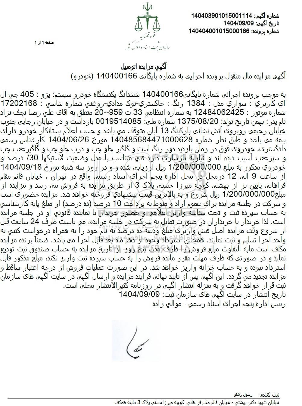 مزایده ششدانگ یکدستگاه خودرو پژو 405 , مزایده ششدانگ یکدستگاه خودرو پژو 405