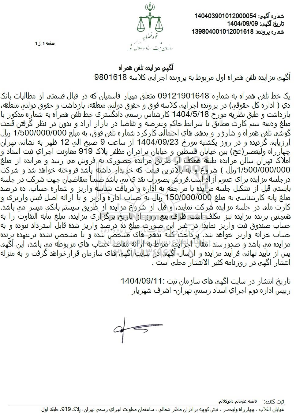آگهی مزایده تلفن همراه اول مربوط به پرونده اجرایی کلاسه 9801618