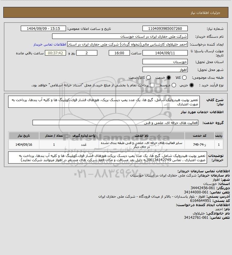 شرح کلی نیاز: تعمیر یونیت هیدرولیک شامل، گیج ها، یک عدد پمپ دیسک بریک، هوزهای فشار قوی،کوپلینگ ها و کلیه آب بندها، پرداخت به صورت اعتباری