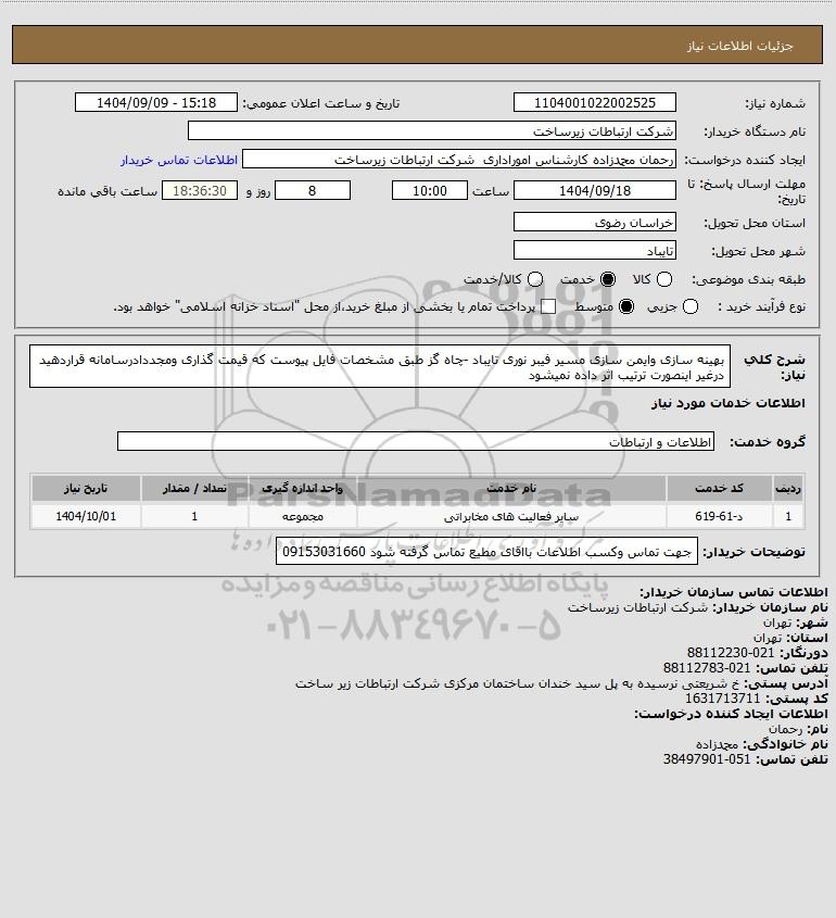 شرح کلی نیاز: بهینه سازی وایمن سازی مسیر فیبر نوری تایباد -چاه گز طبق مشخصات فایل پیوست که قیمت گذاری ومجددادرسامانه قراردهید درغیر اینصورت ترتیب اثر داده نمیشود