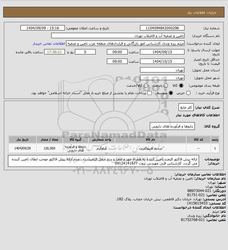 شرح کلی نیاز: کلر مایع
