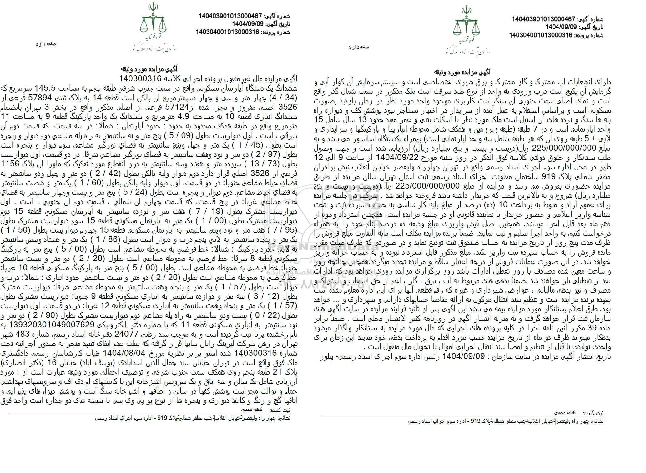 آگهی مزایده مال غیر منقول پرونده اجرائی کلاسه 140300316 ششدانگ یک دستگاه آپارتمان مسکونی واقع در سمت جنوب شرقی طبقه پنجم به مساحت 145.5 متر مربع که (34) . (4) چهار متر و سی و چهار دسیمتر مربع آن بالکن است قطعه 14 به پلاک ثبتی 57894 فرعی از 3526 اصلی مفروز و مجزا شده از 57124 فرعی از اصلی مذکور واقع در بخش 3 تهران بانضمام ششدانگ انباری قطعه 10 به مساحت 4.9 متر مربع و ششدانگ یک واحد پارکینگ قطعه 9 به مساحت 11 متر مربع واقع در طبقه همکف محدود به حدود: حدود آپارتمان : شمالا در سه قسمت که قسمت دوم آن شرقی ، است . اول دیواریست بطول 09 . 5) پنج متر و نه سانتیمتر به راه پله مشاعی دوم دیوار و پنجره است بطول 45 . 1 ) یک متر و چهل و پنج سانتیمتر به فضاي نورگیر مشاعي سوم دیوار و پنجره است بطول (97) . 2 ) دو متر و نود و هفت سانتیمتر به فضای نورگیر مشاعي شرقا در دو قسمت اول دیواریست بطول 73 . 13 ) سیزده متر و هفتاد و سه سانتیمتر به درز انقطاع مورد تفکیک که ماورا آن پلاک 1156 فرعی از 3526 اصلی قرار دارد دوم ديوار ولبه بالكن بطول (42) . 2 ) دو متر و چهل و دو سانتیمتر به فضاي حياط مشاعي جنوبا در دو قسمت اول ديوار ولبه بالكن بطول 60 . 1 ) یک متر و شصت سانتیمتر به فضاي حياط مشاعي دوم دیوار و پنجره است بطول 24 . 5 ) پنج متر و بیست و چهار سانتیمتر به فضاي حیاط مشاعی غربا در پنج قسمت که قسمت چهارم آن شمالي ، قسمت دوم آن جنوبی ، است . اول دیواریست مشترک بطول 19 . 7 ) هفت متر و نوزده سانتیمتر به آپارتمان مسکوني قطعه 15 دوم دیواریست مشترک بطول 00 . 1 ) یک متر به آپارتمان مسکوني قطعه 15 سوم ديواریست مشترک بطول (95 . 7 ) هفت متر و نود و پنج سانتیمتر به آپارتمان مسکونی قطعه 15 چهارم دیواریست بطول (50 . 1 ) یک متر و پنجاه سانتیمتر به لابي پنجم درب و دیوار است بطول 86 . 1 ) یک متر و هشتاد و شش سانتیمتر به لابي حدود پارکینگ : شمالا خط فرضي به محوطه مشاعی است بطول 00 . 5) پنج متر به پارکینگ مسكوني قطعه 8 شرقا خط فرضی به محوطه مشاعی است بطول 20 . 2 ) دو متر و بیست سانتیمتر جنوبا خط فرضي به محوطه مشاعی است بطول 00 . 5) پنج متر به پارکینگ مسکوني قطعه 10 غربا خط فرضی به محوطه مشاعی است بطول 20 . 2 ) دو متر و بیست سانتیمتر حدود انباری : شمالا درب و دیوار است بطول (57) . 1 ) یک متر و پنجاه و هفت سانتیمتر به محوطه مشاعي شرقا دیواریست مشترک بطول 12 . 3 ) سه متر و دوازده سانتیمتر به انباري مسکوني قطعه 9 جنوبا ديواریست مشترک بطول (57 . 1 ) یک متر و پنجاه و هفت سانتیمتر به انباري مسكوني قطعه 12 غربا در دو قسمت اول دیواریست بطول 22 . 0 ) بیست و دو سانتیمتر به راه پله مشاعی دوم دیواریست مشترك بطول (90 . 2 ) دو متر و دو نود سانتیمتر به انباري مسكوني قطعه 11 که با شماره دفتر الکترونيکي 139320301049007629 به نام رخشنده پرنا ثبت گردیده است و به موجب سند رهني 24077 دفترخانه اسناد رسمی شماره 483 شهر تهران در رهن شرکت لیزینگ رایان سایپا قرار گرفته که بعلت عدم ایفای تعهد منجر به صدور اجرائیه تحت شماره 140300316 شده استو برابر نظریه مورخ 1404.08.04 هیات کارشناسان رسمی دادگستری ملک فوق واقع است در تهران خیابان سید جمال الدین اسدآبادي يوسف آباد خیابان 16 دکتر انصاری پلاک 21 طبقه پنجم روی همکف سمت جنوب شرقي و توصيف اجمالی مورد وثیقه عبارت است از : مورد ارزیابی شامل یک سالن و سه اتاق و یک سرویس اشپزخانه این با کابینتهای ام دی اف و سرویسهای بهداشتی حمام و توالت مجز است پوشش کفها در سالن و اطاقها و اشپزخانه سنگ است و پوشش دیوارهای پذیرایی و اتاقها گچ و رنگ و کاغذ دیواری و پنجره ها از نوع یو پی وی سی با شیشه های دو جداره است واحد فوق دارای انشعابات آب مشترک و گاز مشترک و برق شهری اختصاصی است.....