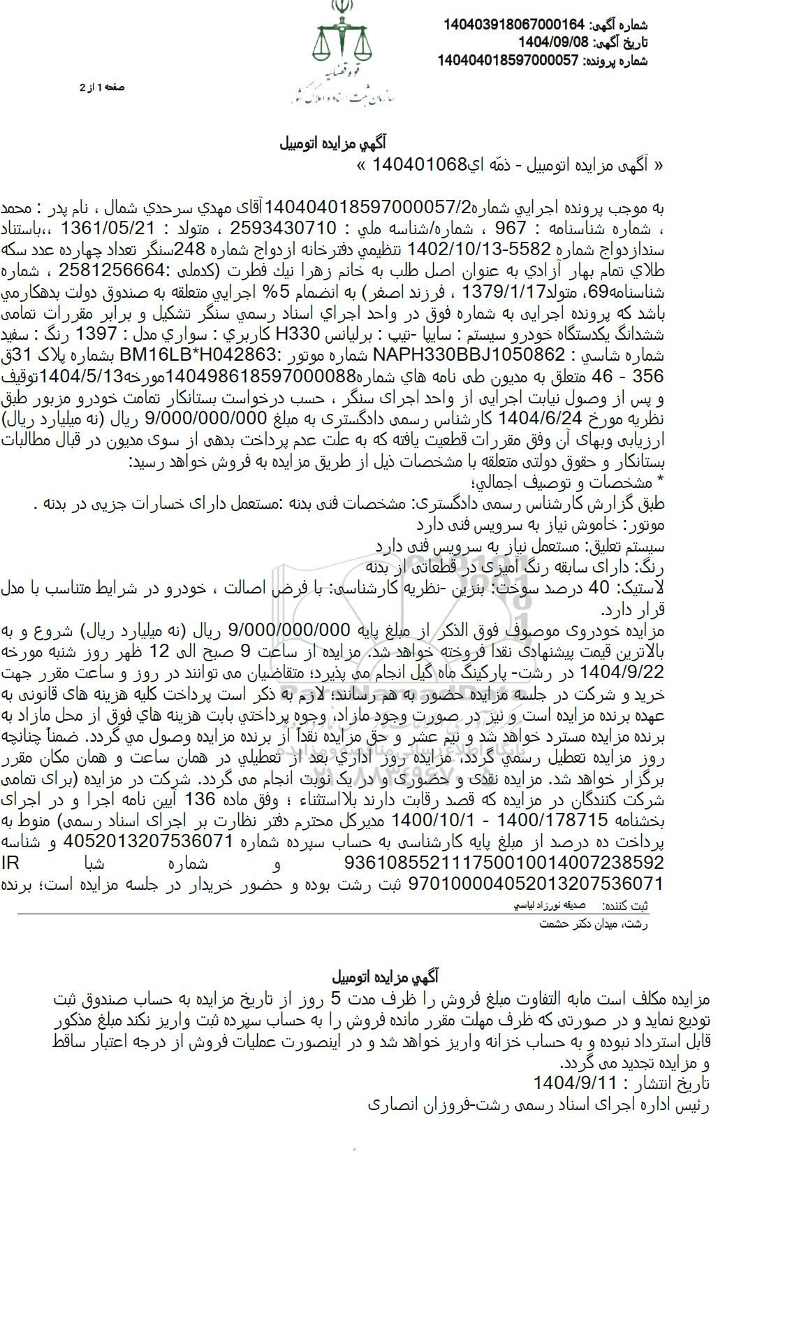 به موجب پرونده اجرایی شماره 140404018597000057.2 آقای مهدی سرحدی شمال ، نام پدر : محمد ، شماره شناسنامه : 967، شماره . شناسه ملی : 2593430710 ، متولد : 1361.05.21 ، باستناد سند ازدواج شماره 5582-1402.10.13 تنظیمی دفترخانه ازدواج شماره 248 سنگر تعداد چهارده عدد سکه طلای تمام بهار آزادی به عنوان اصل طلب به خانم زهرا نیک فطرت کدملی : 2581256664 ، شماره شناسنامه 69، متولد 1379.1.17 ، فرزند اصفر به انضمام 5 اجرایی متعلقه به صندوق دولت بدهکار می باشد که پرونده اجرایی به شماره فوق در واحد اجرای اسناد رسمی سنگر تشکیل و برابر مقررات تمامی ششدانگ یکدستگاه خودرو سیستم : سایپا - تیپ : برلیانس H330 کاربری : سواری مدل : 1397 رنگ : سفید بشماره پلاک 31 ق BM16LBH042863 شماره موتور NAPH330BBJ1050862 : شماره شاسی 356 - 46 متعلق به مدیون طی نامه های شماره 140498618597000088 مورخه 1404.5.13 توقیف و پس از وصول نیابت اجرایی از واحد اجرای سنگر ، حسب درخواست بستانکار تمامت خودرو مزبور طبق نظریه مورخ 1404.6.24 کارشناس رسمی دادگستری به مبلغ 9.000.000.000 ریال نه میلیارد ریال ارزیابی و بهای آن وفق مقررات قطعیت یافته که به علت عدم پرداخت بدهی از سوی مدیون در قبال مطالبات بستانکار و حقوق دولتی متعلقه با مشخصات ذیل از طریق مزایده به فروش خواهد رسید مشخصات و توصیف اجمالی طبق گزارش کارشناس رسمی دادگستری مشخصات فنی بدنه مستعمل دارای خسارات جزیی در بدنه موتور خاموش نیاز به سرویس فنی دارد