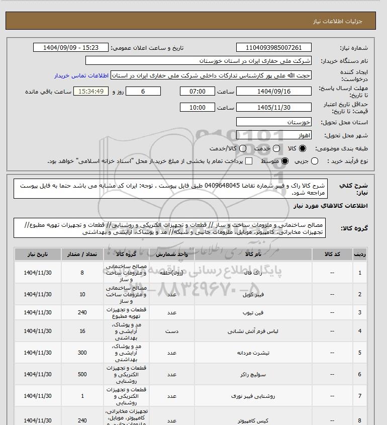 شرح کلی نیاز: شرح کالا راک و فیبر شماره تقاضا 0409648045 طبق فایل پیوست . توجه: ایران کد مشابه می باشد حتما به فایل پیوست مراجعه شود.