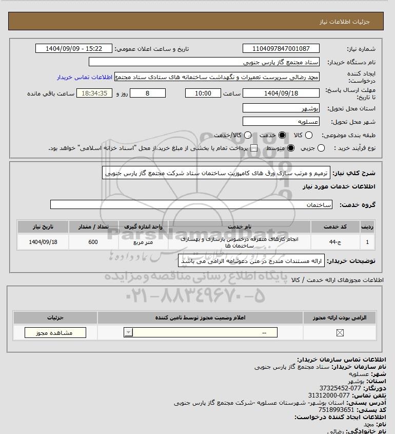 شرح کلی نیاز: ترمیم و مرتب سازی ورق های کامپوزیت ساختمان ستاد شرکت مجتمع گاز پارس جنوبی