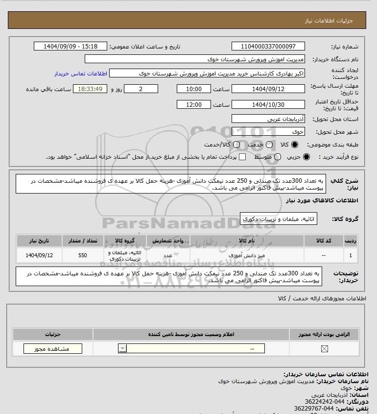 نام دستگاه خریدار:مدیریت اموزش وپرورش شهرستان خوی