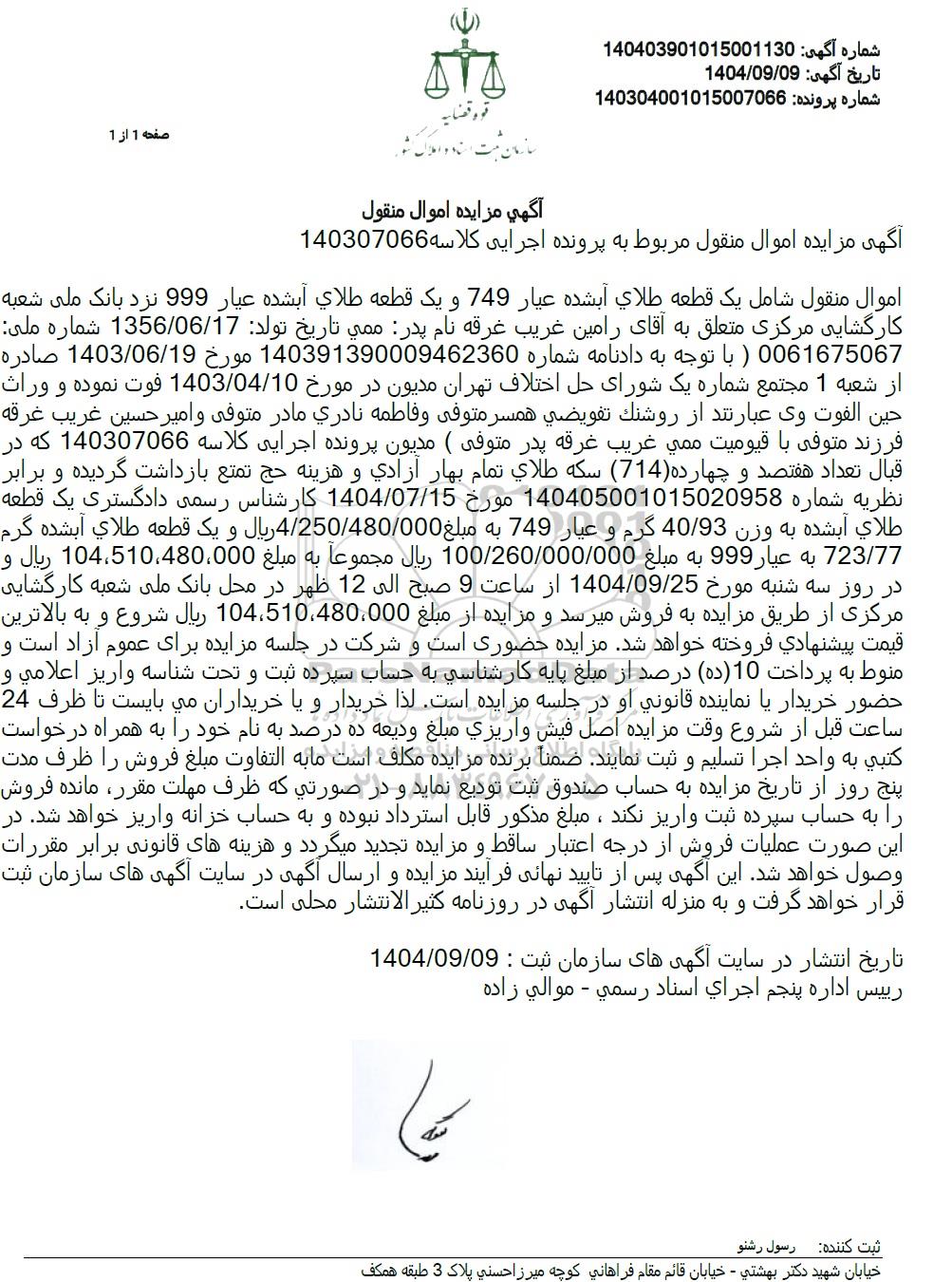اموال منقول شامل یک قطعه طلای آبشده عیار 749 و یک قطعه طلای آبشده عیار 999 نزد بانک ملی شعبه کارگشایی مرکزی متعلق به آقای رامین غریب غرقه نام پدر ممی تاریخ تولد : 1356.06.17 شماره ملی 0061675067 با توجه به دادنامه شماره 140391390009462360 مورخ 1403.06.19 صادره از شعبه 1 مجتمع شماره یک شورای حل اختلاف تهران مدیون در مورخ 1403.04.10 فوت نموده و وراث حین الفوت وی عبارتند از روشنک تفویضی همسر متوفى وفاطمه نادری مادر متوفی و امیر حسین غریب غرقه فرزند متوفی با قیومیت ممی غریب غرقه پدر متوفی مدیون پرونده اجرایی کلاسه 140307066 که در قبال تعداد هفتصد و چهارده (714) سکه طلای تمام بهار آزادی و هزینه حج تمتع بازداشت گردیده و برابر نظریه شماره 140405001015020958 مورخ 1404.07.15 کارشناس رسمی دادگستری یک قطعه طلای آبشده به وزن 40.93 گرم و عیار 749 به مبلغ 4.250.480.000 ریال و یک قطعه طلای آبشده گرم 723.77 به عیار 999 به مبلغ 100.260.000.000 ریال مجموعاً به مبلغ 104.510.480.000 ریال و در روز سه شنبه مورخ 1404.09.25 از ساعت 9 صبح الی 12 ظهر در محل بانک ملی شعبه کارگشایی مرکزی از طریق مزایده به فروش میرسد و مزایده از مبلغ 104.510.480.000 ریال شروع و به بالاترین قیمت پیشنهادی فروخته خواهد شد. مزایده حضوری است و شرکت در جلسه مزایده برای عموم آزاد است و منوط به پرداخت (10 ده) درصد از مبلغ پایه کارشناسی به حساب سپرده ثبت و تحت شناسه واریز اعلامی و حضور خریدار یا نماینده قانونی او در جلسه مزایده است. لذا خریدار و یا خریداران می بایست تا ظرف 24 ساعت قبل از شروع وقت مزایده اصل فیش واریزی مبلغ ودیعه ده درصد به نام خود را به همراه درخواست کتبی به واحد اجرا تسلیم و ثبت نمایند. ضمنا برنده مزایده مکلف است ما به التفاوت مبلغ فروش را ظرف مدت پنج روز از تاریخ مزایده به حساب صندوق ثبت تودیع نماید و در صورتی که ظرف مهلت مقرر مانده فروش را به حساب سپرده ثبت واریز نکند، مبلغ مذکور قابل استرداد نبوده و به حساب خزانه واریز خواهد شد. در این صورت عملیات فروش از درجه اعتبار ساقط و مزایده تجدید میگردد و هزینه های قانونی برابر مقررات وصول خواهد شد. این اگهی پس از تایید نهایی فرآیند مزایده و ارسال آگهی در سایت آگهی های سازمان ثبت قرار خواهد گرفت و به منزله انتشار آگهی در روزنامه کثیر الانتشار محلی است.