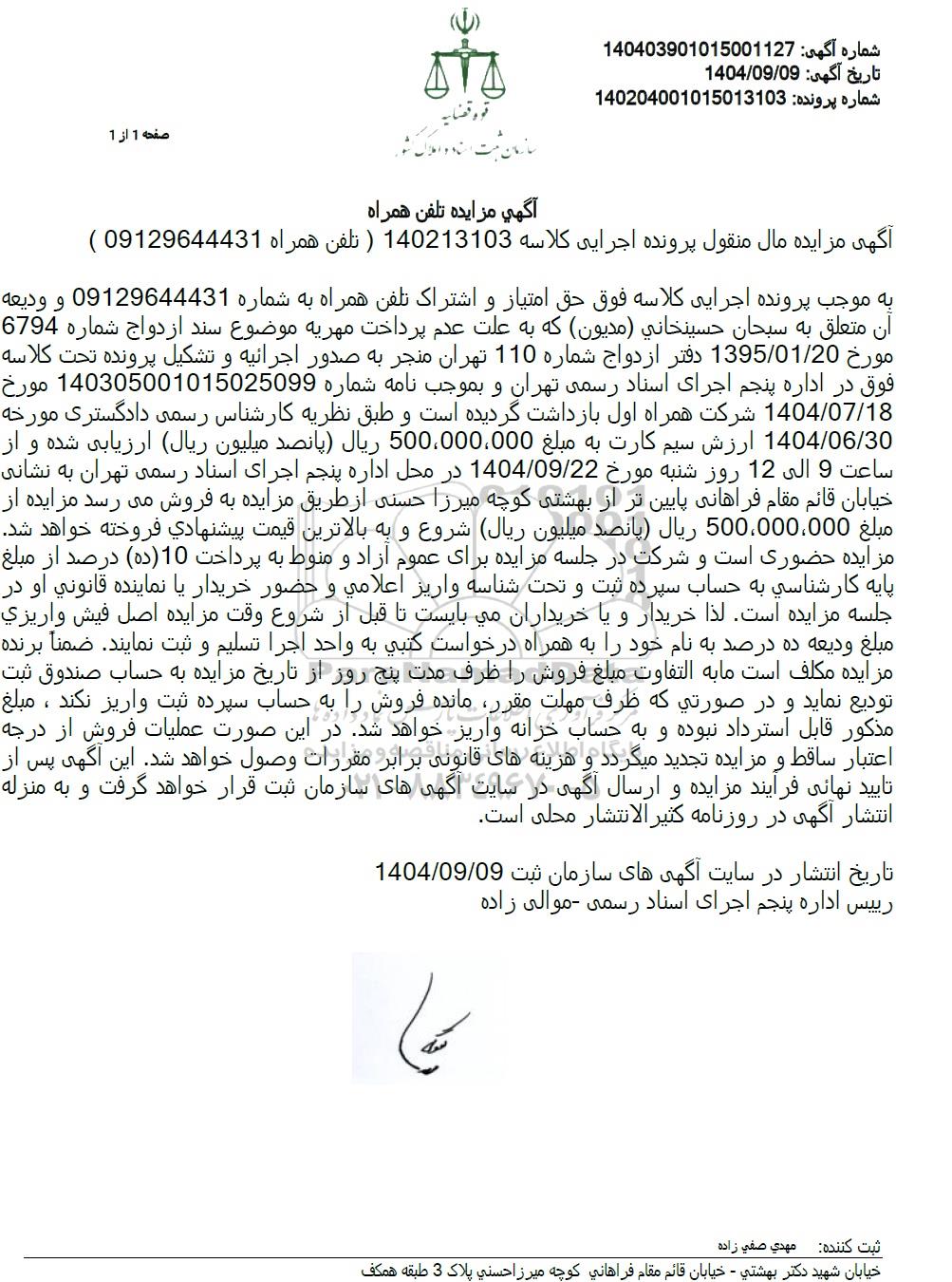 به موجب پرونده اجرایی کلاسه فوق حق امتیاز و اشتراک تلفن همراه به شماره 09129644431 و ودیعه ان متعلق به سبحان حسینخانی (مدیون) که به علت عدم پرداخت مهریه موضوع سند ازدواج شماره 6794 مورخ 1395/01/20 دفتر ازدواج شماره 110 تهران منجر به صدور اجرائیه و تشکیل پرونده تحت کلاسه فوق در اداره پنجم اجرای اسناد رسمی تهران و بموجب نامه شماره 140305001015025099 مورخ 1404/07/18 شرکت همراه اول بازداشت گردیده است و طبق نظریه کارشناس رسمی دادگستری مورخه 1404.06.30 ارزش سیم کارت به مبلغ 500،000،000 ريال پانصد میلیون ریال ارزیابی شده و از ساعت 9 الی 12 روز شنبه مورخ 1404.09.22 در محل اداره پنجم اجرای اسناد رسمی تهران به نشانی خیابان قائم مقام فراهانی پایین تر از بهشتی کوچه میرزا حسنی از طریق مزایده به فروش می رسد مزایده از مبلغ 500،000،000 ریال پانصد میلیون ریال شروع و به بالاترین قیمت پیشنهادی فروخته خواهد شد. مزایده حضوری است و شرکت در جلسه مزایده برای عموم آزاد و منوط به پرداخت 10 (ده) درصد از مبلغ پایه کارشناسی به حساب سپرده ثبت و تحت شناسه واریز اعلامی و حضور خریدار یا نماینده قانونی او در جلسه مزایده است. لذا خریدار و یا خریداران می بایست تا قبل از شروع وقت مزایده اصل فیش واريزي مبلغ ودیعه ده درصد به نام خود را به همراه درخواست کتبی به واحد اجرا تسلیم و ثبت نمایند. ضمناً برنده مزایده مکلف است ما به التفاوت مبلغ فروش را ظرف مدت پنج روز از تاریخ مزایده به حساب صندوق ثبت تودیع نماید و در صورتی که ظرف مهلت مقرر مانده فروش را به حساب سپرده ثبت واریز نکند ، مبلغ مذکور قابل استرداد نبوده و به حساب خزانه واریز خواهد شد. در این صورت عملیات فروش از درجه اعتبار ساقط و مزایده تجدید میگردد و هزینه های قانونی برابر مقررات وصول خواهد شد. این آگهی پس از تایید نهایی فرآیند مزایده و ارسال آگهی در سایت آگهی های سازمان ثبت قرار خواهد گرفت و به منزله انتشار آگهی در روزنامه کثیر الانتشار محلی است.