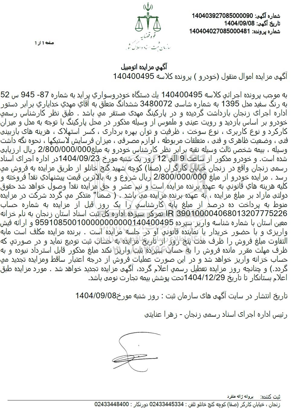 آگهی مزایده اموال منقول (خودرو) پرونده کلاسه 140400495