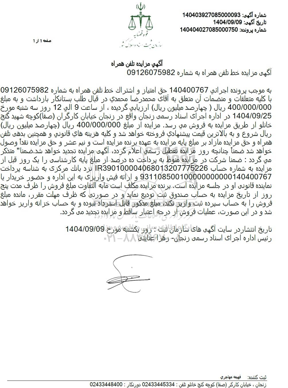 به موجب پرونده اجرائی 140400767 حق امتیاز و اشتراک خط تلفن همراه به شماره 09126075982 با کلیه متعلقات و منضمات آن متعلق به آقای محمدرضا محمدی در قبال طلب بستانکار بازداشت و به مبلغ 400.000.000 ریال ( چهار صد میلیون ریال) ارزیابی گردیده، از ساعت 9 الی 12 روز سه شنبه مورخ 1404.09.25 در اداره اجرای اسناد رسمی زنجان واقع در زنجان خیابان کارگران (صفا) کوچه شهید گنج خانلو از طریق مزایده به فروش می رسد. مزایده از مبلغ 400.000.000 ریال چهارصد میلیون ریال ریال شروع و به بالاترین قیمت پیشنهادی فروخته خواهد شد و کلیه هزینه های قانونی و همچنین بدهی تلفن همراه و حق مزایده مازاد بر مبلغ پایه مزایده به عهده برنده مزایده است و نیم عشر و حق مزایده نقداً وصول خواهد شد ضمنا چنانچه روز مزایده تعطیل رسمی اعلام گردد آگهی مزایده تجدید خواهد شد. ضمنا" متذکر می گردد : ضمنا شرکت در مزایده منوط به پرداخت ده درصد از مبلغ پایه کارشناسی را یک روز قبل از مزایده به شماره حساب IR390100004068013207775226 نزد بانک مرکزی به شناسه پرداخت 100000000000140400767 931108500 و ارائه فیش واریزی به این اداره و حضور خریدار یا نماینده قانونی او در جلسه مزایده است. برنده مزایده مکلف است ما به التفاوت مبلغ فروش را ظرف مدت پنج روز از تاریخ مزایده به حساب صندوق ثبت تودیع نماید و در صورتی که ظرف مهلت مقرر مانده مبلغ فروش را به حساب سپرده ثبت واریز نکند مبلغ مذکور قابل استرداد نبوده و به حساب خزانه واریز خواهد شد و در این صورت عملیات فروش از درجه اعتبار ساقط و مزایده تجدید می گردد.