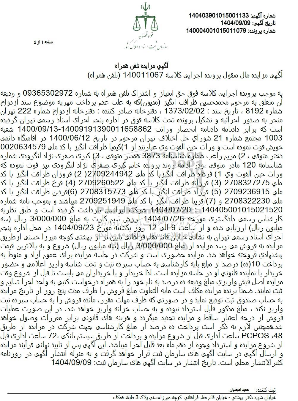 به موجب پرونده اجرایی کلاسه فوق حق امتیاز و اشتراک تلفن همراه به شماره 09365302972 و ودیعه آن متعلق به مرحوم محمد حسین ظرافت انگیز مدیون) که به علت عدم پرداخت مهریه موضوع سند ازدواج شماره 8192 ، تاریخ سند : 1373/02/02 ، دفترخانه صادر کننده : دفترخانه ازدواج شماره 222 تهران منجر به صدور اجرائیه و تشکیل پرونده تحت کلاسه فوق در اداره پنجم اجرای اسناد رسمی تهران گردیده است که برابر دادنامه دادنامه انحصار وراثت 14009191390011658862-1400/09/13 شعبه 1003 مجتمع شماره 21 شورای حل اختلاف تهران مرحوم در تاریخ 1400/06/12 در اقامتگاه دائمی خویش فوت نموده است و وراث حین الفوت وی عبارتند از (1) کیمیا ظرافت انگیز با کد ملی 0020634579 دختر متوفی ، (2) مریم راغب شماره شناسنامه 3873 همسر متوفی ،(3) کبری صفری نژاد لنگرودی شماره شناسنامه 120 مادر متوفی و در ادامه روند پرونده خانم کبری صفری نژاد لنگرودی نیز فوت نموده که وراث حین الفوت وی 1) فرهاد ظرافت انگیز با کد ملی 2709244942 (2) فروزان ظرافت انگیز با کد ملی 2708327275 (3) فرزانه ظرافت انگیز با کد ملی 2709260522 (4) فرخ ظرافت انگیز با کد ملی 2709236915 (5) فرزاد ظرافت انگیز با کد ملی 2708315773 (6) فردین ظرافت انگیز با کد ملی 2708322230 و (7) فریبا ظرافت انگیز با کد ملی 2709251949 میباشند و بموجب نامه شماره 140405001015021520 : 1404.07.20 شرکت ایرانسل بازداشت گردیده است و طبق نظریه کارشناس رسمی دادگستری مورخه 1404.07.26 ارزش سیم کارت به مبلغ 3.000.000 ریال (سه میلیون ریال ارزیابی شده و از ساعت 9 الی 12 روز یکشنبه مورخ 1404.09.23 در محل اداره پنجم اجرای اسناد رسمی تهران به نشانی خیابان قائم مقام فراهانی پایین تر از بهشتی کوچه میرزا حسنی از طریق مزایده به فروش می رسد مزایده از مبلغ 3.000.000 ریال سه میلیون ریال شروع و به بالاترین قیمت پیشنهادی فروخته خواهد شد. مزایده حضوری است و شرکت در جلسه مزایده برای عموم آزاد و منوط به پرداخت 10 (ده ) درصد از مبلغ پایه کارشناسی به حساب سپرده ثبت و تحت شناسه واریز اعلامی و حضور خریدار یا نماینده قانونی او در جلسه مزایده است. لذا خریدار و یا خریداران می بایست تا قبل از شروع وقت مزایده اصل فیش واریزی مبلغ ودیعه ده درصد به نام خود را به همراه درخواست کتبی به واحد اجرا تسلیم و ثبت نمایند. ضمنا برنده مزایده مکلف است ما به التفاوت مبلغ فروش را ظرف مدت پنج روز از تاریخ مزایده به حساب صندوق ثبت تودیع نماید و در صورتی که ظرف مهلت مقرر مانده فروش را به حساب سپرده ثبت واریز نکند ، مبلغ مذکور قابل استرداد نبوده و به حساب خزانه واریز خواهد شد. در این صورت عملیات فروش از درجه اعتبار ساقط و مزایده تجدید میگردد و هزینه های قانونی برابر مقررات وصول خواهد شد. همچنین لازم به ذکر است پرداخت ده درصد از مبلغ کارشناسی جهت شرکت در مزایده از طریق 48 PCPOS ساعت اداری قبل از شروع مزایده و پرداخت از طریق سیستم بانکی 72 ساعت اداری قبل از شروع مزایده و استرداد وجوه از دهم ماه بعد قابل اجرا میباشد. این آگهی پس از تایید نهایی فرآیند مزایده و ارسال آگهی در سایت آگهی های سازمان ثبت قرار خواهد گرفت و به منزله انتشار آگهی در روزنامه کثیر الانتشار محلی است. تاریخ انتشار در سایت آگهی های سازمان ثبت: 1404.09.09