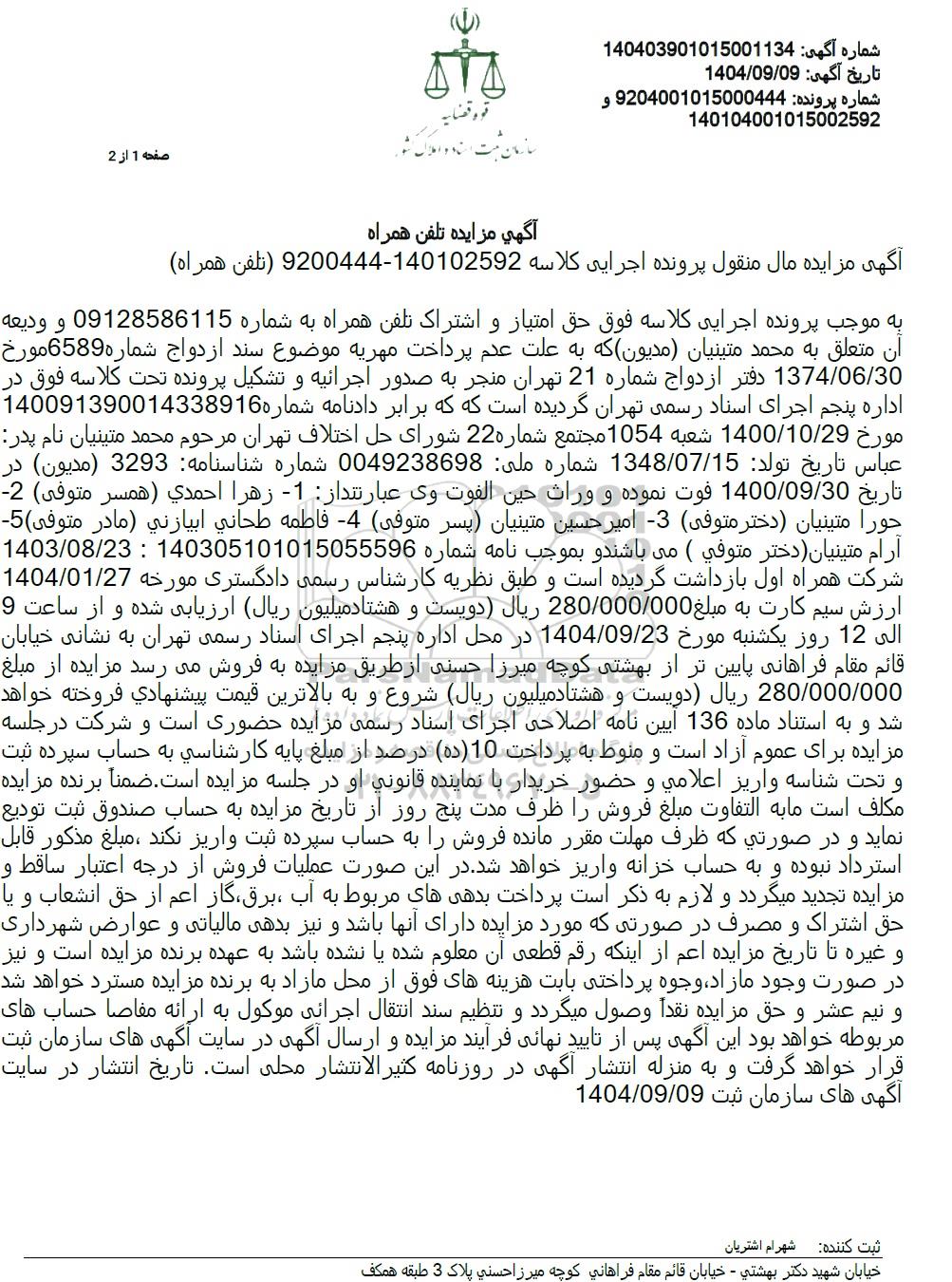 به موجب پرونده اجرایی کلاسه فوق حق امتیاز و اشتراک تلفن همراه به شماره 09128586115 و ودیعه آن متعلق به محمد متینیان (مدیون) که به علت عدم پرداخت مهریه موضوع سند ازدواج شماره 6589 مورخ 1374.06.30 دفتر ازدواج شماره 21 تهران منجر به صدور اجرائیه و تشکیل پرونده تحت کلاسه فوق در اداره پنجم اجرای اسناد رسمی تهران گردیده است که که برابر دادنامه شماره 140091390014338916 مورخ 1400.10.29 شعبه 1054 مجتمع شماره 22 شورای حل اختلاف تهران مرحوم محمد متینیان نام پدر عباس تاریخ تولد : 1348.07.15 شماره ملی: 0049238698 شماره شناسنامه 3293 (مدیون) در تاریخ 1400.09.30 فوت نموده و وراث حین الفوت وی عبارتنداز : -1 زهرا احمدی (همسر متوفی 2 حورا متینیان (دختر) (متوفی - امیر حسین متینیان پسر (متوفی -4 فاطمه طحانی ابیازنی مادر متوفی 5 آرام متینیان دختر متوفی ) می باشند و بموجب نامه شماره 140305101015055596 : 1403.08.23 شرکت همراه اول بازداشت گردیده است و طبق نظریه کارشناس رسمی دادگستری مورخه 1404.01.27 ارزش سیم کارت به مبلغ 280.000.000 ریال دویست و هشتاد میلیون ریال ارزیابی شده و از ساعت 9 الی 12 روز یکشنبه مورخ 1404.09.23 در محل اداره پنجم اجرای اسناد رسمی تهران به نشانی خیابان قائم مقام فراهانی پایین تر از بهشتی کوچه میرزا حسنی از طریق مزایده به فروش میرسد مزایده از مبلغ 280.000.000 ریال دویست و هشتاد میلیون ریال شروع و به بالاترین قیمت پیشنهادی فروخته خواهد شد و به استناد ماده 136 آیین نامه اصلاحی اجرای اسناد رسمی مزایده حضوری است و شرکت در جلسه مزایده برای عموم آزاد است و منوط به پرداخت (10(ده) درصد از مبلغ پایه کارشناسی به حساب سپرده ثبت و تحت شناسه واریز اعلامی و حضور خریدار با نماینده قانونی او در جلسه مزایده است. ضمنا برنده مزایده مکلف است ما به التفاوت مبلغ فروش را ظرف مدت پنج روز از تاریخ مزایده به حساب صندوق ثبت تودیع نماید و در صورتی که ظرف مهلت مقرر مانده فروش را به حساب سپرده ثبت واریز نکند ، مبلغ مذکور قابل استرداد نبوده و به حساب خزانه واریز خواهد شد. در این صورت عملیات فروش از درجه اعتبار ساقط و مزایده تجدید میگردد و لازم به ذکر است پرداخت بدهیهای مربوط به آب برق گاز اعم از حق انشعاب و یا حق اشتراک و مصرف در صورتی که مورد مزایده دارای آنها باشد و نیز بدهی مالیاتی و عوارض شهرداری و غیره تا تاریخ مزایده اعم از اینکه رقم قطعی آن معلوم شده یا نشده باشد به عهده برنده مزایده است و نیز در صورت وجود مازاد وجوه پرداختی بابت هزینه های فوق از محل مازاد به برنده مزایده مسترد خواهد شد و نیم عشر و حق مزایده نقداً وصول میگردد و تنظیم سند انتقال اجرائی موکول به ارائه مفاصا حساب های مربوطه خواهد بود این آگهی پس از تایید نهایی فرآیند مزایده و ارسال آگهی در سایت آگهی های سازمان ثبت قرار خواهد گرفت و به منزله انتشار آگهی در روزنامه کثیر الانتشار محلی است تاریخ انتشار در سایت 1404.09.09 آگهی های سازمان ثبت