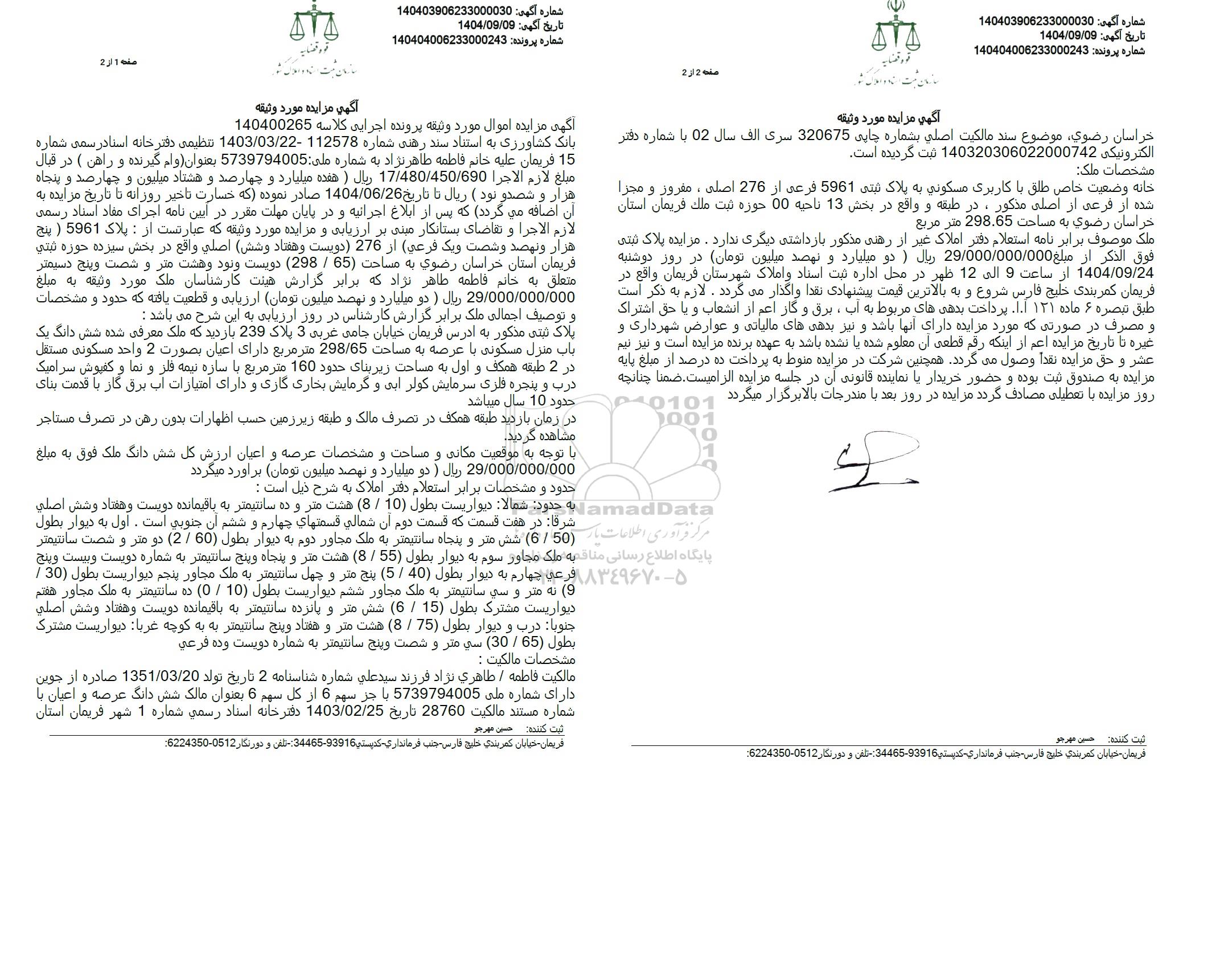 آگهی مزایده اموال مورد وثیقه پرونده اجرایی کلاسه 140400265