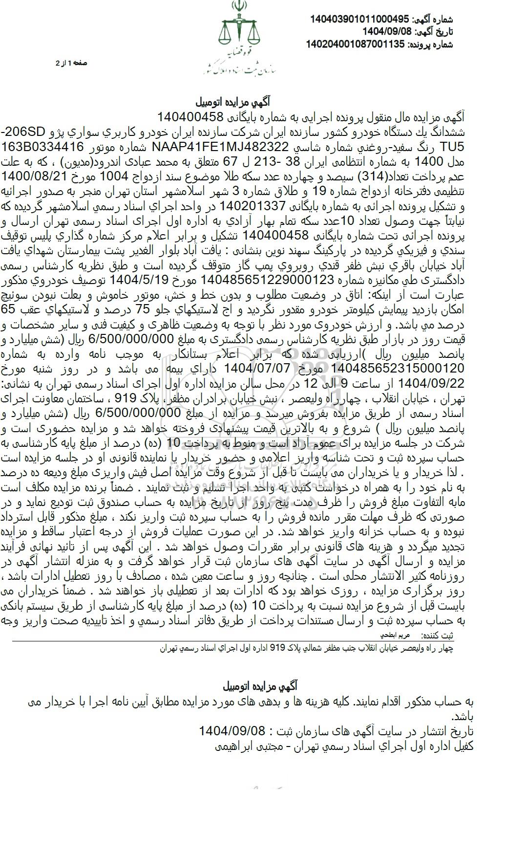 ششدانگ یک دستگاه خودرو کشور سازنده ایران شرکت سازنده ایران خودرو کاربری سواری پژو 206SD TU5 رنگ سفید - روغنی شماره شاسی NAAP41FE1MJ482322 شماره موتور 163B0334416 مدل 1400 به شماره انتظامی ایران 2133- ل 67 متعلق به محمد عبادی اندرود (مدیون) ، که به علت عدم پرداخت تعداد (314) سیصد و چهارده عدد سکه طلا موضوع سند ازدواج 1004 مورخ 1400.08.21 تنظیمی دفترخانه ازدواج شماره 19 و طلاق شماره 3 شهر اسلامشهر استان تهران منجر به صدور اجرائیه و تشکیل پرونده اجرائی به شماره بایگانی 140201337 در واحد اجرای اسناد رسمی اسلامشهر گردیده که نیابتاً جهت وصول تعداد 10 عدد سکه تمام بهار آزادی به اداره اول اجرای اسناد رسمی تهران ارسال و پرونده اجرانی تحت شماره بایگانی 140400458 تشکیل و برابر اعلام مرکز شماره گذاری پلیس توقیف سندی و فیزیکی گردیده در پارکینگ سهند نوین بنشانی یافت آباد بلوار الغدیر روبروی پمپ گاز متوقف گردیده است و طبق نظریه کارشناس رسمی دادگستری طی مکانیزه شماره 140485651229000123 مورخ 1404.5.19 توصیف خودروی مذکور عبارت است از از اینکه اتاق در وضعیت مطلوب و بدون خط و خش مطلوب و بدون . موتور خاموش و بعلت نبودن سوئیچ امکان بازدید پیمایش کیلومتر خودرو مقدور نگردید و اج لاستیکهای جلو 75 درصد و لاستیکهای عقب 65 درصد میباشد و ارزش خودروی مورد نظر با توجه به وضعیت ظاهری و کیفیت فنی و سایر مشخصات و قیمت روز در بازار طبق نظریه کارشناس رسمی دادگستری به مبلغ 6.500.000.000 ریال شش میلیارد و پانصد میلیون ریال ارزیابی شده که برابر اعلام بستانکار به موجب نامه وارده به شماره 140485652315000120 مورخ 1404.07.07 دارای بیمه می باشد و در روز رسمی شنبه مورخ 1404.09.22 از ساعت 9 الی 12 در محل سالن مزایده اداره اول اجرای استاد را تهران به نشانی تهران، خیابان انقلاب ، چهارراه ولیعصر ، نبش خیابان برادران مظفر، پلاک 919 . ساختمان معاونت اجرای اسناد رسمی از طریق مزایده بفروش میرسد و مزایده از مبلغ 6.500.000.000 ریال شش میلیارد و پانصد میلیون ریال شروع و به بالاترین قیمت پیشنهادی فروخته خواهد شد و مزایده حضوری است و شرکت در جلسه مزایده برای عموم آزاد است و منوط به پرداخت 10 (ده) درصد از مبلغ پایه کارشناسی به حساب سپرده ثبت و تحت شناسه واریز اعلامی و حضور خریدار یا نماینده قانونی او در جلسه مزایده است. لذا خریدار و یا خریداران می بایست تا قبل از شروع وقت مزایده اصل فیش واریزی مبلغ ودیعه ده درصد به نام خود را به همراه درخواست کتبی به واحد اجرا تسلیم و ثبت نمایند . ضمناً برنده مزایده مکلف است ما به التفاوت مبلغ فروش را ظرف مدت پنج روز از تاریخ مزایده به حساب صندوق ثبت تودیع نماید و در صورتی که ظرف مهلت مقرر مانده فروش را به حساب سپرده ثبت واریز نکند ، مبلغ مذکور قابل استرداد نبوده و به حساب خزانه واریز خواهد شد. در این صورت عملیات فروش از درجه اعتبار ساقط و مزایده تجدید میگردد و هزینه های قانونی برابر مقررات وصول خواهد شد. این اگهی پس از تائید نهانی فرآیند مزایده و ارسال آگهی در سایت آگهی های سازمان ثبت قرار خواهد گرفت و به منزله انتشار آگهی در روزنامه کثیر الانتشار محلی است. چنانچه روز و ساعت معین شده، مصادف با روز تعطیل ادارات باشد . روز برگزاری مزایده، روزی خواهد بود که ادارات بعد از تعطیلی باز خواهند شد. ضمناً خریداران می بایست قبل از شروع مزایده نسبت به پرداخت 10 (ده) درصد از مبلغ پایه کارشناسی از طریق سیستم بانکی به حساب سپرده ثبت و ارسال مستندات پرداخت از طریق دفاتر اسناد رسمی و اخذ تاییدیه صحت واریز وجه به حساب مذکور اقدام نمایند. کلیه هزینه ها و بدهیهای مورد مزایده مطابق آیین نامه اجرا با خریدار می باشد.
