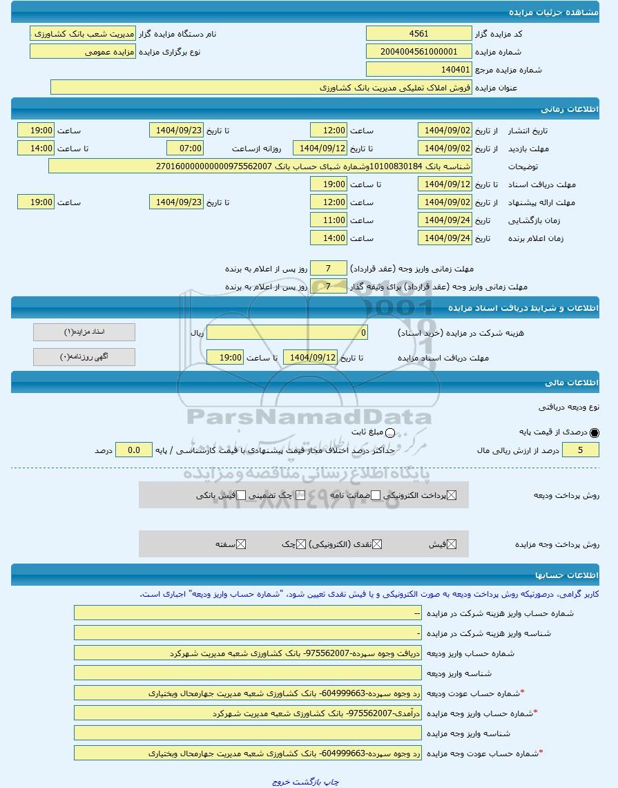 | شماره حساب واریز وجه مزایده | درآمدی-975562007- بانک کشاورزی شعبه مدیریت شهرکرد |