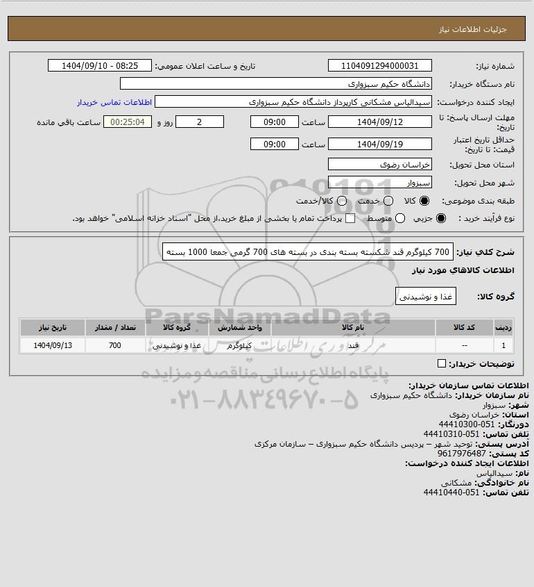 شرح کلی نیاز: 700 کیلوگرم قند شکسته بسته بندی در بسته های 700 گرمی جمعا 1000 بسته