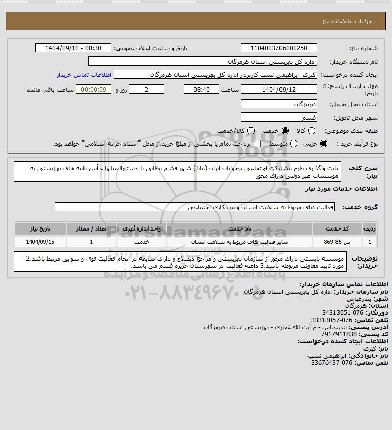 شرح کلی نیاز: بابت واگذاری طرح مشارکت اجتماعی نوجوانان ایران (مانا) شهر قشم مطابق با دستورالعملها و آیین نامه های بهزیستی به موسسات غیر دولتی دارای مجوز