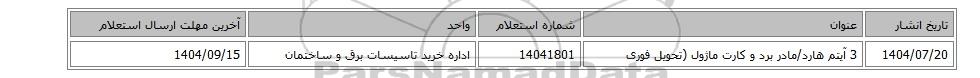 | 1404/07/20 | 3 آیتم هارد/مادر برد و کارت ماژول (تحویل فوری | 14041801 | اداره خرید تاسیسات برق و ساختمان | 1404/09/15 |