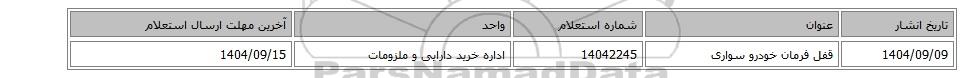 1404/09/09قفل ‎فرمان خودرو‏ ‎سواری‏14042245اداره خرید دارایی و ملزومات1404/09/15