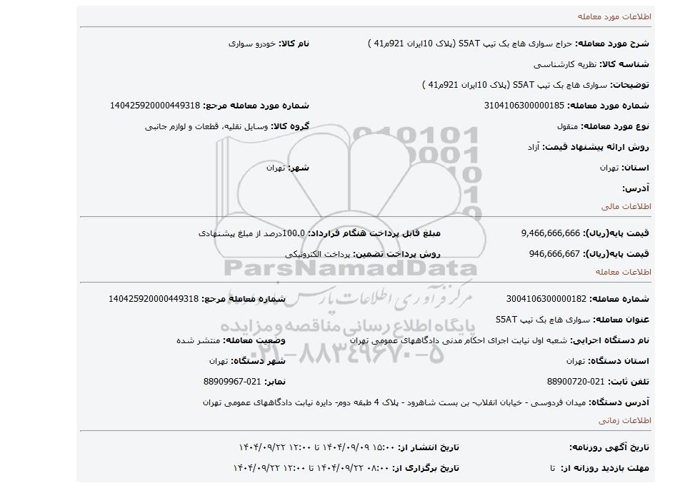| شرح مورد معامله: حراج سواری هاچ بک تیپ S5AT (پلاک 10ایران 921م41 ) | نام کالا: خودرو سواری | |