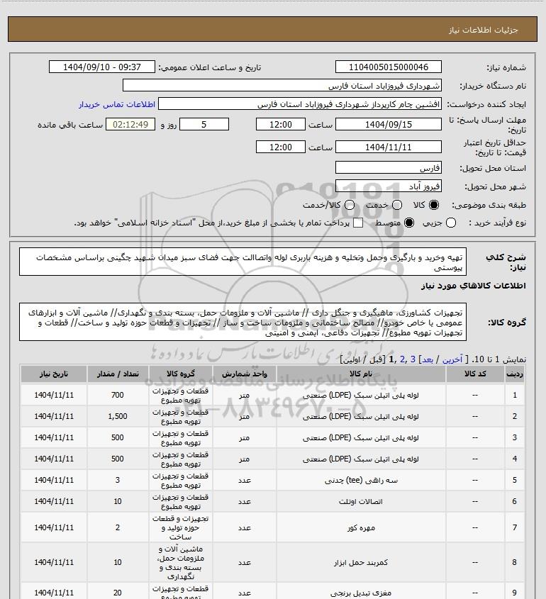 شرح کلی نیاز: تهیه وخرید و بارگیری وحمل وتخلیه و هزینه باربری لوله واتصاالت جهت فضای سبز