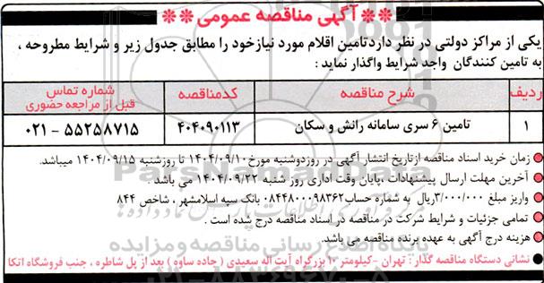 | 1 | تامین 6 سری سامانه رانش و سکان | 404090113 | 55258715 - 021 |