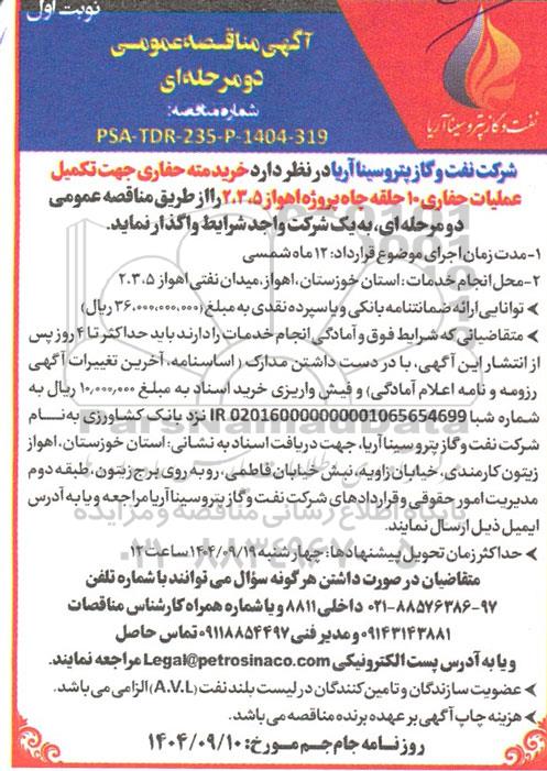 شرکت نفت و گاز پتروسینا آریا در نظر دارد جهت برگزاری مناقصه خرید مته حفاری جهت تکمیل عملیات حفاری 10 حلقه چاه پروژه اهواز 5 ،3 ،2 را از طریق مناقصه عمومی دو مرحله ای به یک شرکت واجد شرایط واگذار نماید.