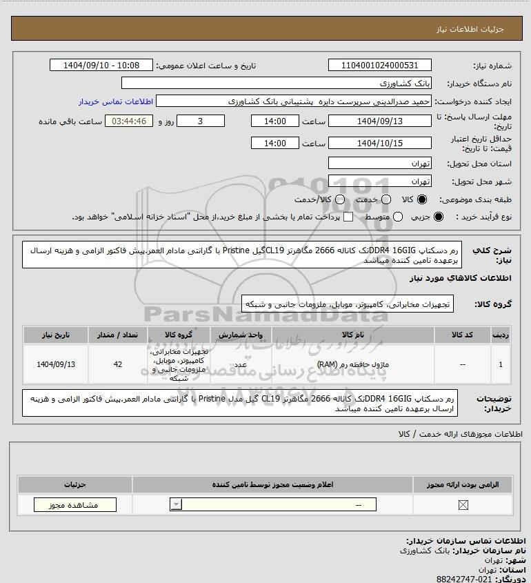 | 1 | -- | ماژول حافظه رم (RAM) | عدد | تجهیزات مخابراتی، کامپیوتر، موبایل، ملزومات جانبی و شبکه | 42 | 1404/09/13 |