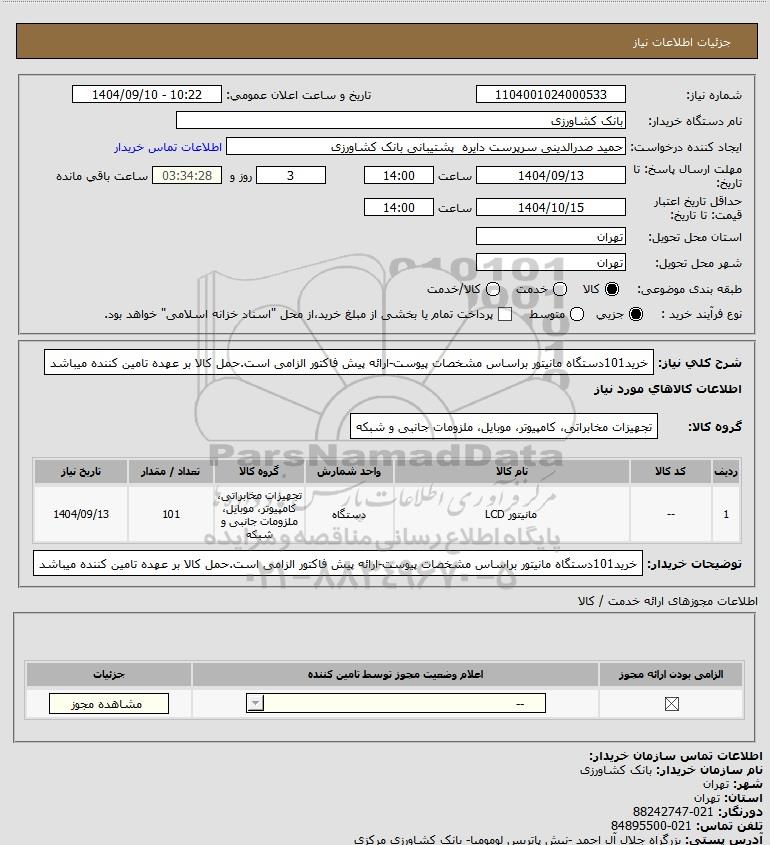 شرح کلی نیاز: خرید101دستگاه مانیتور براساس مشخصات پیوست-ارائه پیش فاکتور الزامی است.حمل کالا بر عهده تامین کننده میباشد