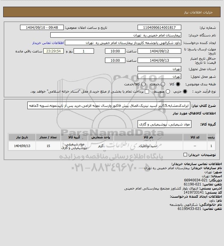 شرح کلی نیاز: ایراندکدمشابه.15لیتر اسید نیتریک.الصاق پیش فاکتور وارسال نمونه الزامی.خرید پس از تاییدنمونه.تسویه 3ماهه