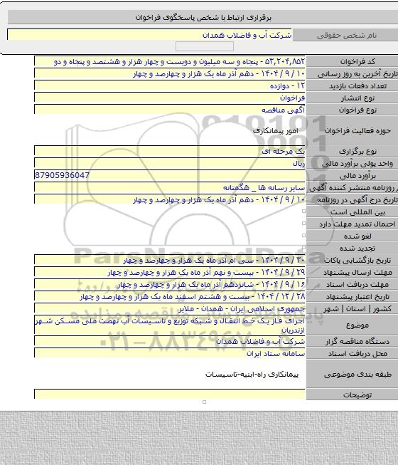 مناقصه اجرای فاز یک خط انتقال و شبکه توزیع و تاسیسات آب نهضت ملی مسکن شهر ازندریان از کلیه افراد متخصص و شرکتها واجد شرایط دعوت به عمل میآید در مناقصه با کد خبرگزاری پارس نماد: 9926486 شرکت نمایند.