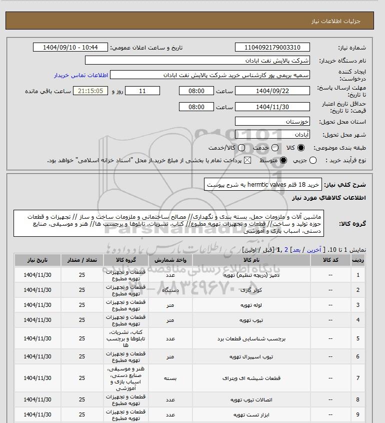 شرح کلی نیاز: خرید 18 قلم hermtic valves به شرح پیوست