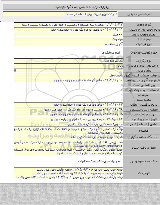 واگذاری تعمیر ، نگهداری ، رفع حوادث و اتفاقات شبکه های توزیع برق شهری و روستایی امور برق کامیاران